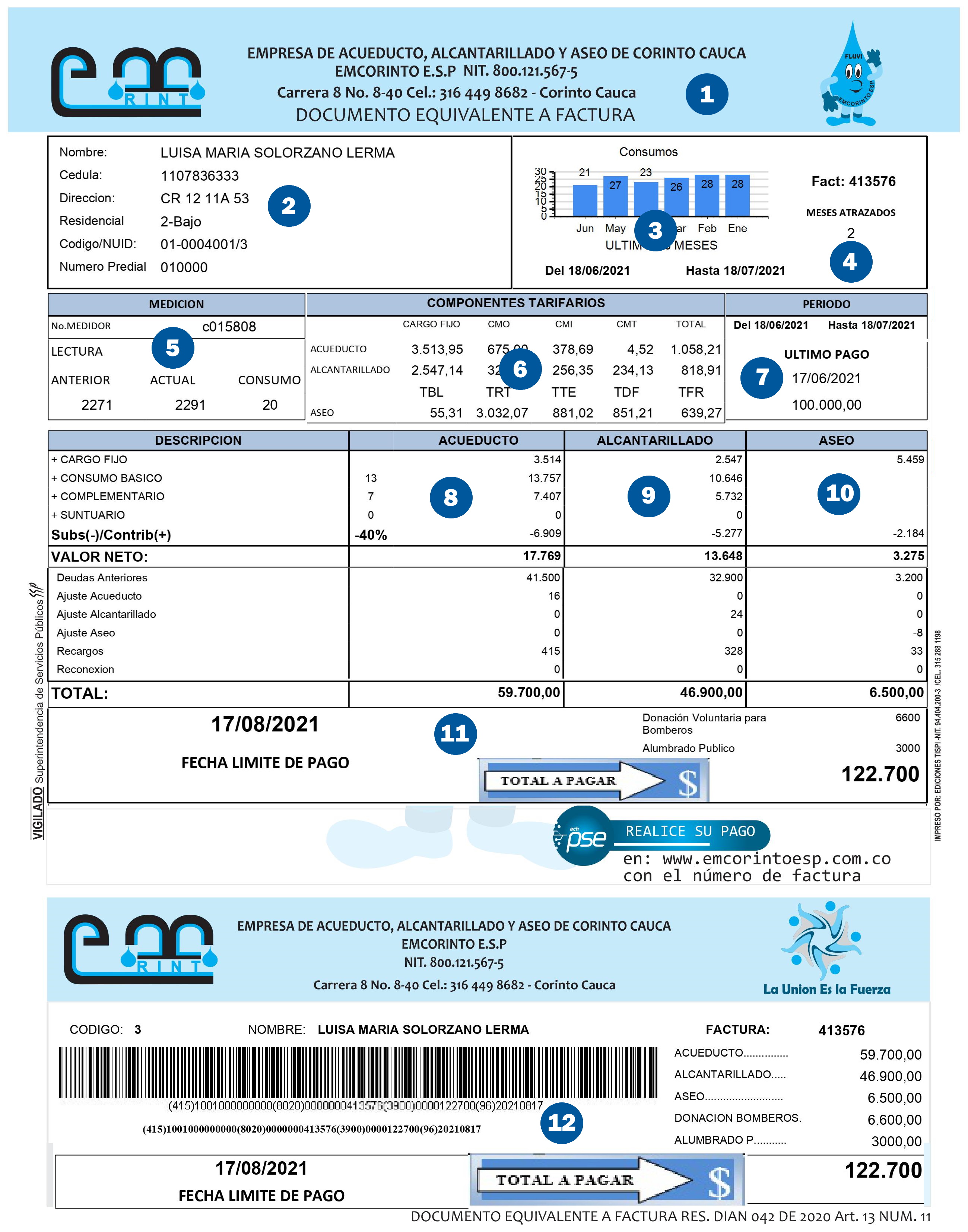 12Cupón desprendible que contiene información básica de la factura que queda en la Empresa como comprobante de Pago.
